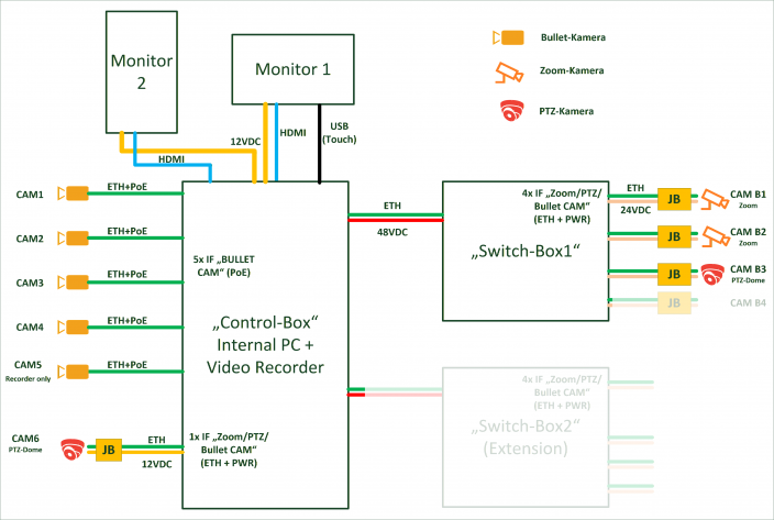 Die Erweiterungsboxen benötigen nur ein Datenkabel (Ethernet) und ein Versorgungs-Kabel (48VDC) zum Anschluss. Dadurch verringert sich der Verdrahtungsaufwand zu weit entfernten Kameras deutlich. Ferner sind so auch Entfernungen von über 100 Metern möglich, die sonst über Ethernet nicht ohne weiteres zu realisieren sind.